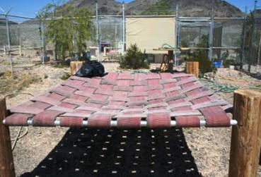 One thing I really wanted to do was sleep outside with BB. As mentioned earlier, Scott and Zuzana had built one of their fire hose hammocks just outside BB's enclosure, in a kind of 'training arena'. It took a little getting used to, as it had a fairly deep dip in the center. The prevailing winds also tended to blow mist from the misters onto the hammock. This was sort of OK during the day, but would not be OK at night. Although I tried several things to see if I could make sleeping there work, I never did succeed. And with the raging cold, I really didn't want to be outside at night, anyway (It also never occurred to me that it would have been easy to shut the misters off at night). Even with these challenges, I did take plenty of naps there. That was, of course, if Shady would let me! It was during these naps that I could listen to the world around me. It was quiet enough much of the time to hear the 'whoop whoop whoop' of the wings of the crows slowly flying overhead. And of course, Pahrump is still 'wild Nevada'. You could hear all sorts of shooting going on in the hills, including automatic weapons fire!