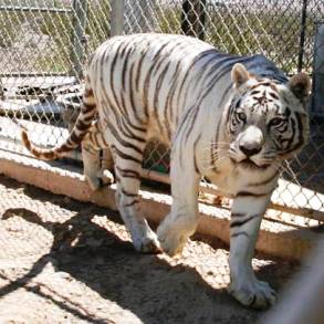 One routine, reliable thing at Zuzana's place is 'Pepper' the tiger. Pepper is Zuzana's first big cat, and one I have met many times before. Pepper is a shy, reserved cat that does not like large numbers of people. So the first few times I visited, I was with a large group, and Pepper hid most of the time. But when I am alone, or with 1 or 2 others, Pepper now eagerly comes up to the fence for attention. Pepper is a white tiger. She has a longer snout than most tigers I 'know' (And I have since learned that there are as many different tiger head shapes as there are tigers). She kind of reminds me of 'Tigger' of 'Whinnie the Poo' fame. Pepper knows the drill at feeding time and is consistent with her food habits, etc. Pepper also enjoys interacting with two of the wolf dogs who are in an enclosure that shares a common wall with hers. She is often there, sitting with them, or playing with them. Her enclosure is also the largest of all the big cats, and can be partitioned off in various ways with remotely-actuated doors. She also has a concrete swimming tank (purpose-built for a tiger and not a re-used swimming pool) that was constructed at the same time as the house.